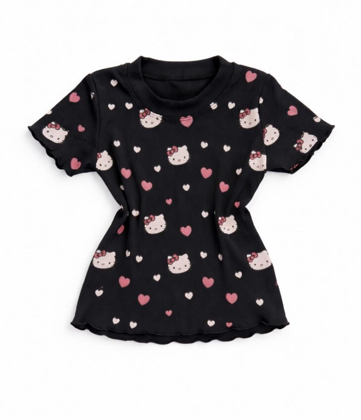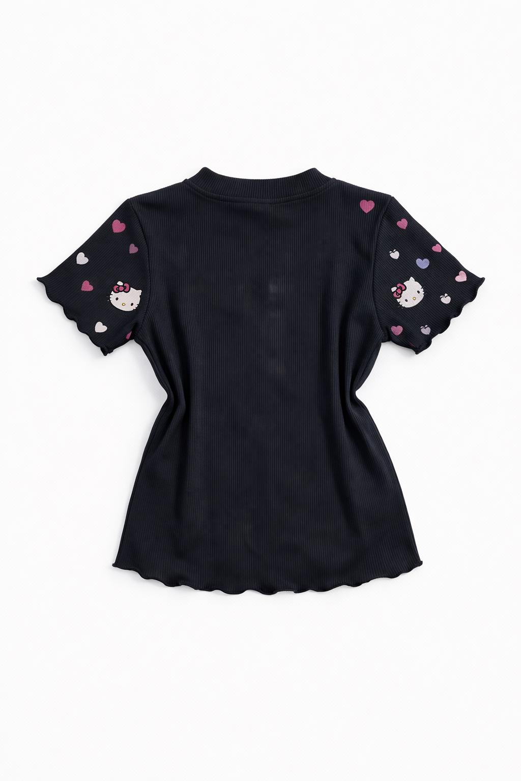 Blusa Infantil Feminina Manga Curta Canelada Preta com Corações