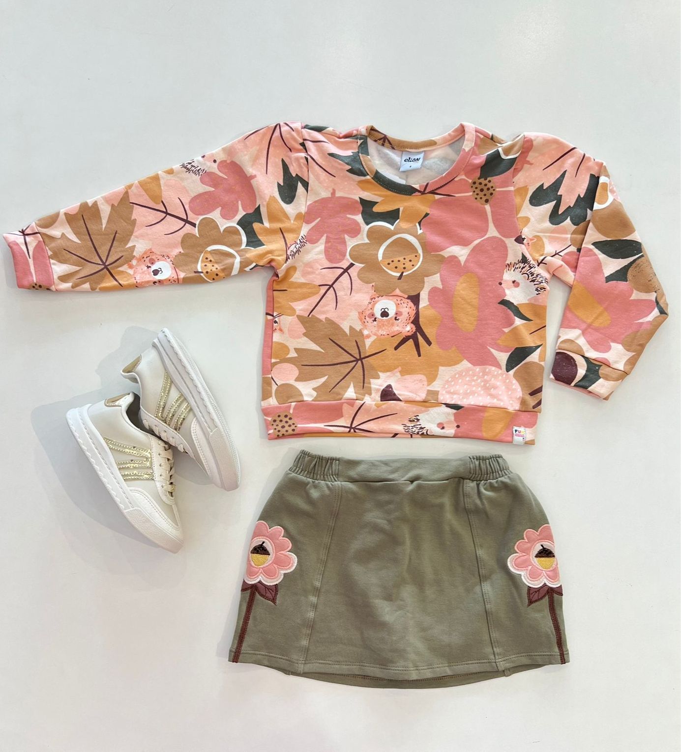 Conjunto Infantil Feminino Blusa Manga Longa Estampada Rosa e Short Saia