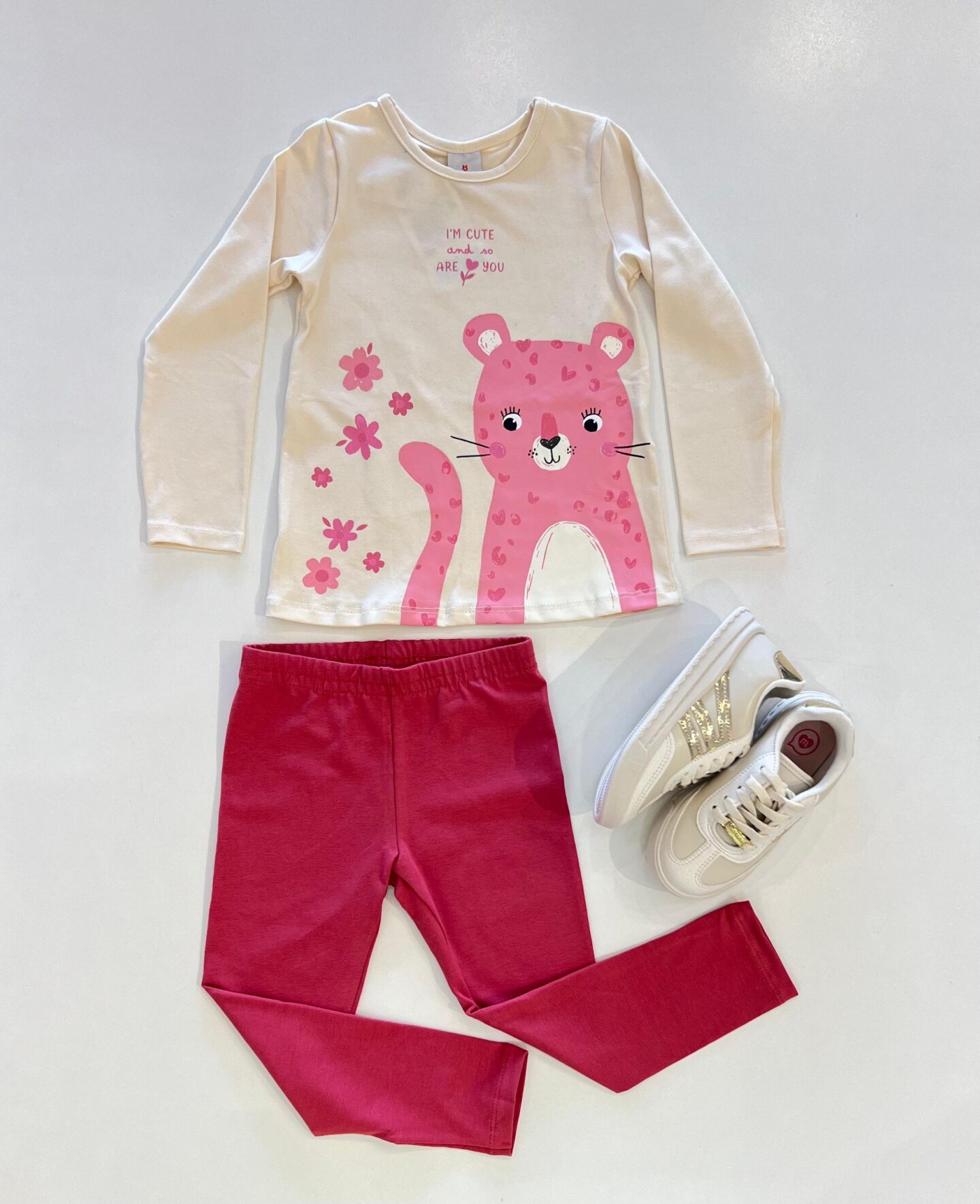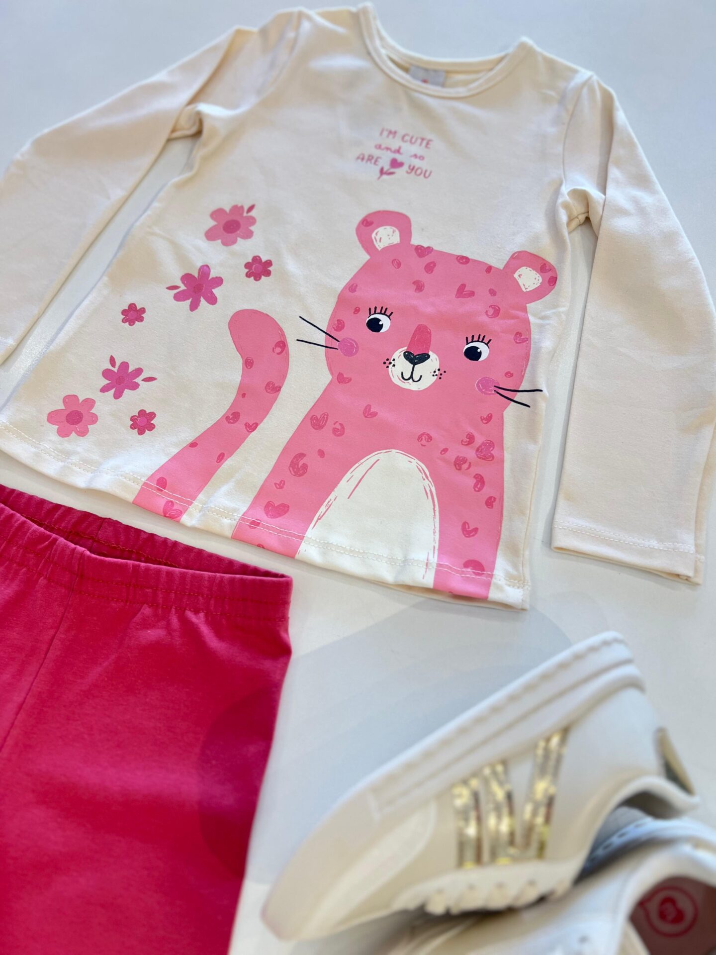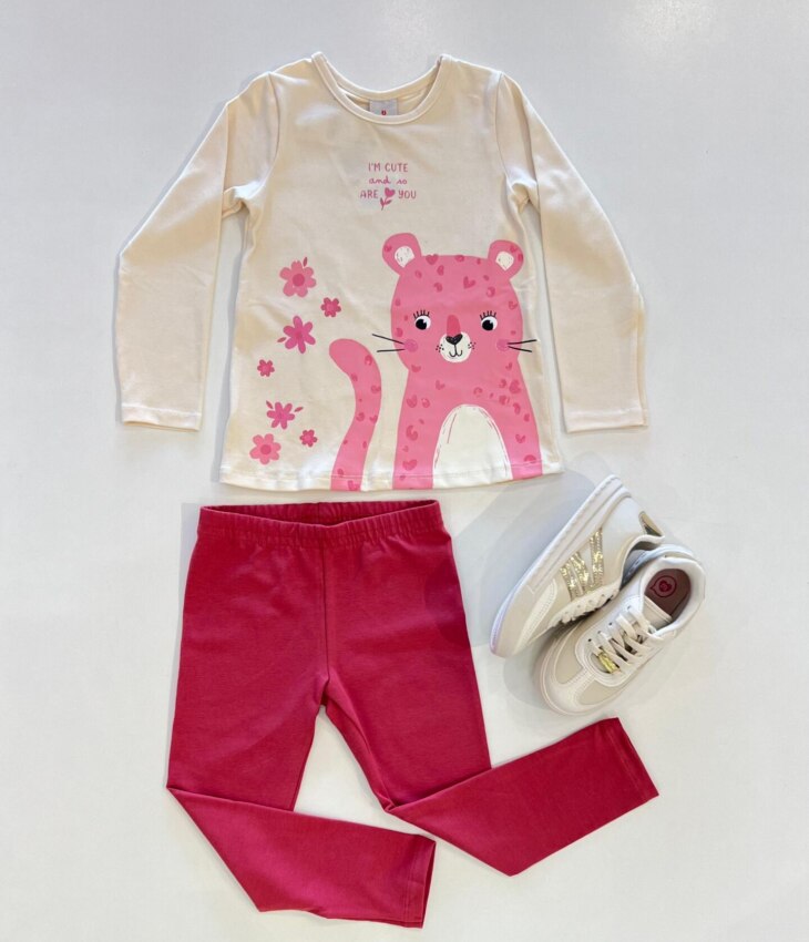Conjunto Infantil Feminino Blusa Manga Longa Gatinha Rosa e Legging