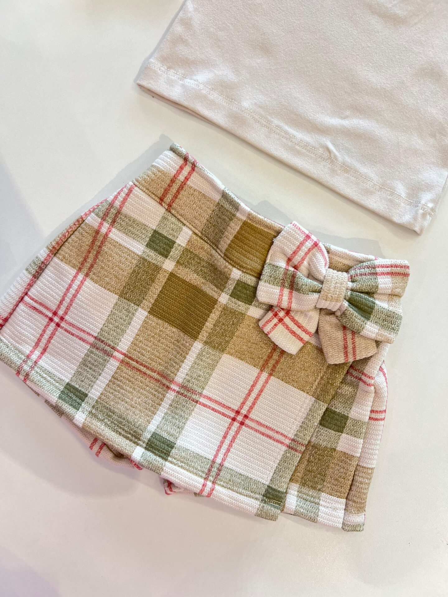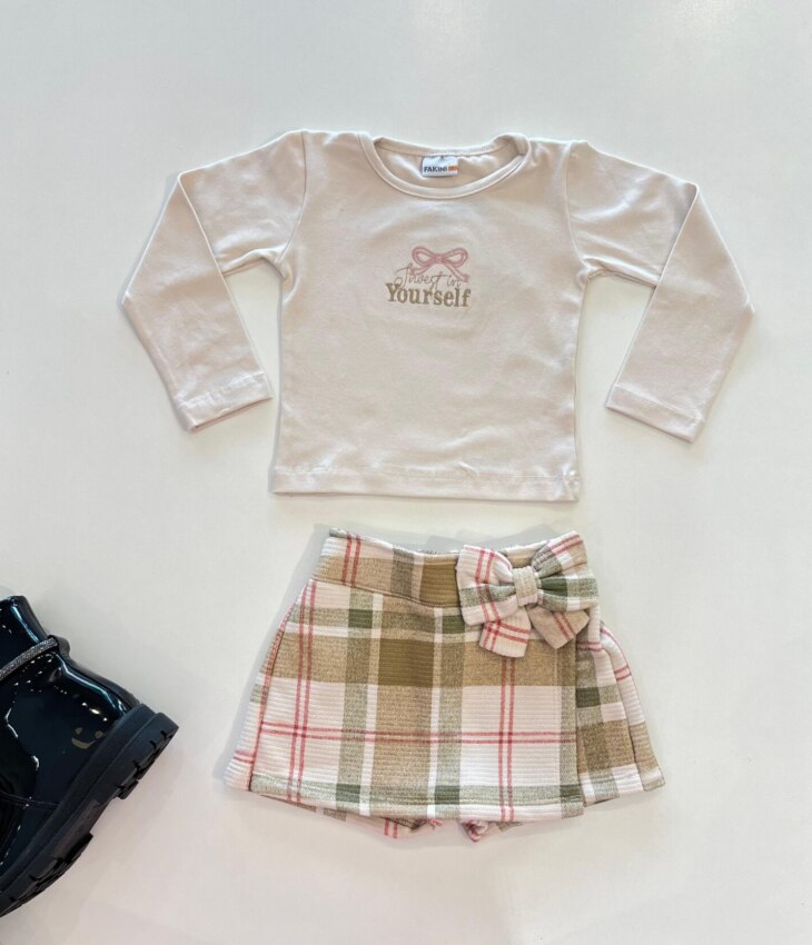 Conjunto Infantil Feminino Blusa Manga Longa Laço e Short Saia Xadrez