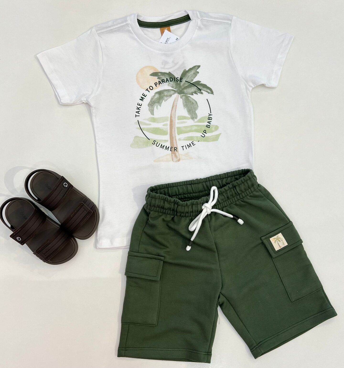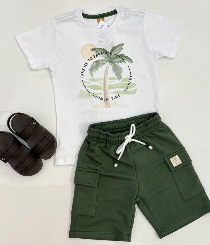 Estilo e diversão garantidos: camiseta e bermuda, o conjunto perfeito para os pequenos aventureiros!