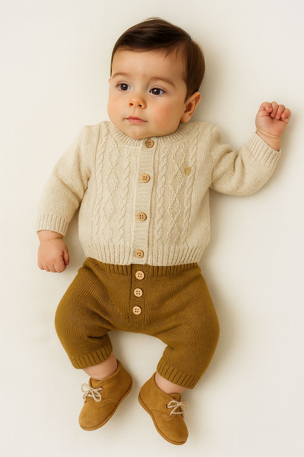 Conjunto Infantil Masculino Casaco Trico Bege e Calça Marrom