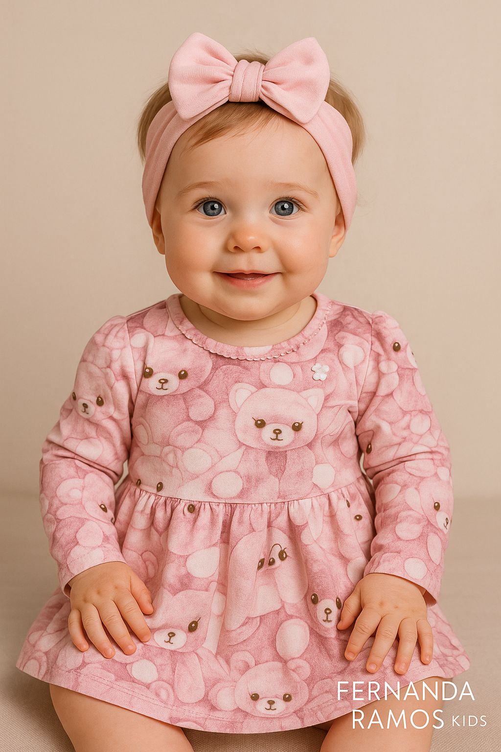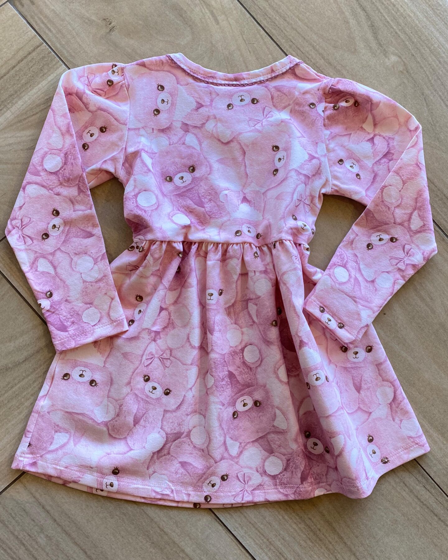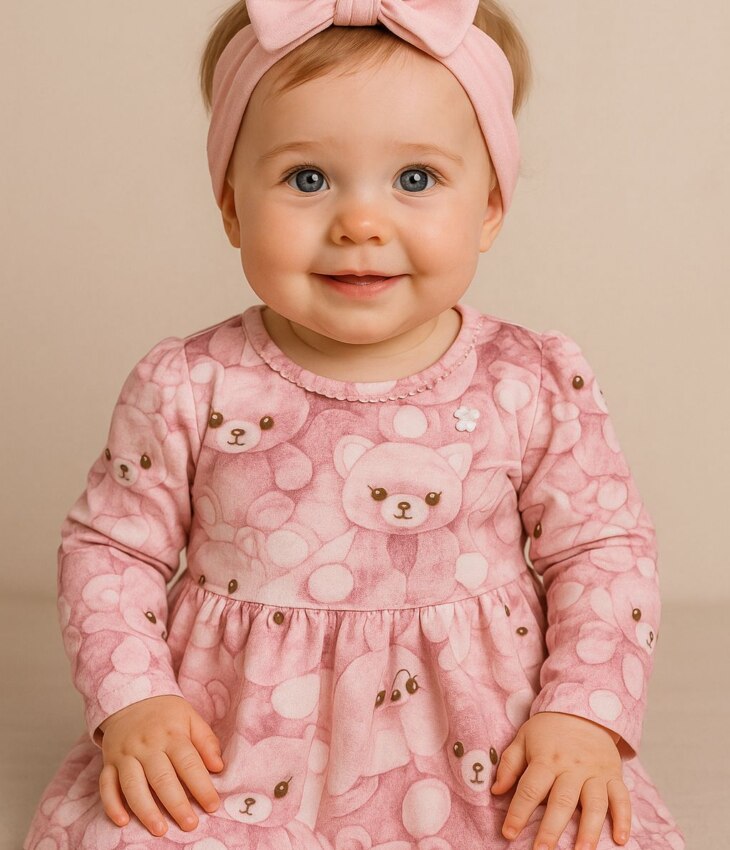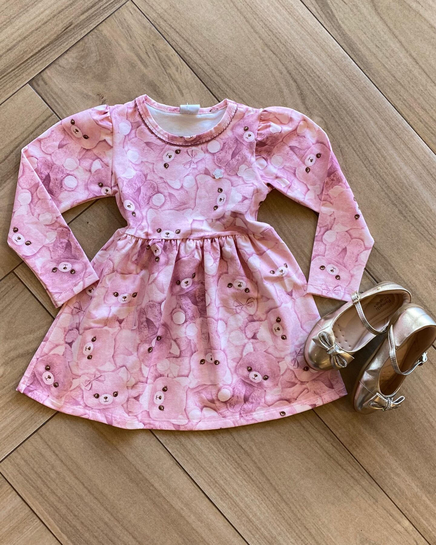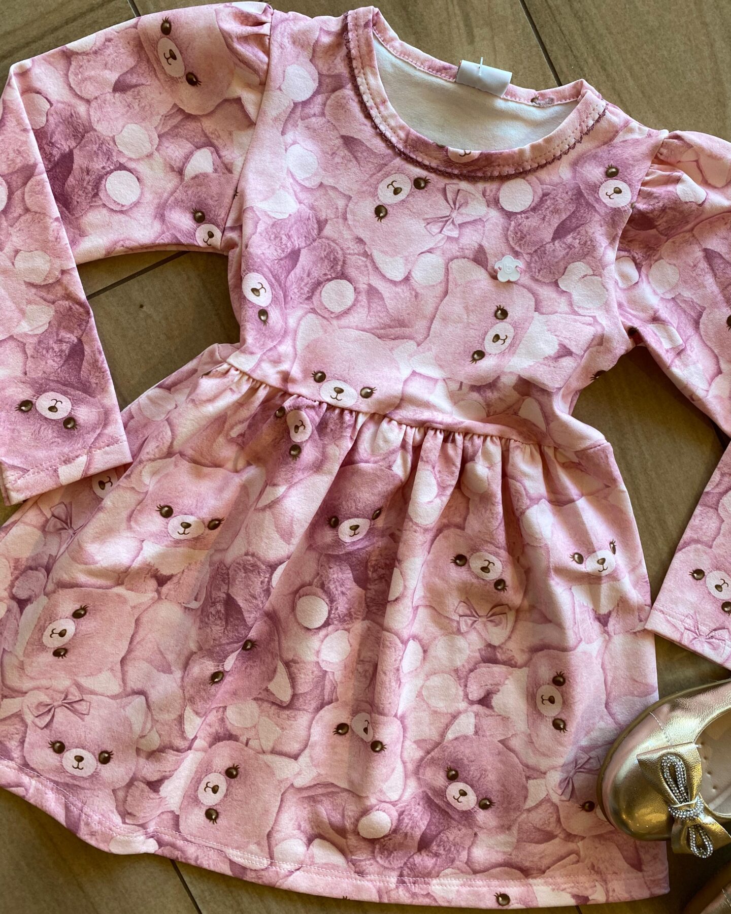 Vestido Infantil Feminino Manga Longa Estampa Ursinho Rosa